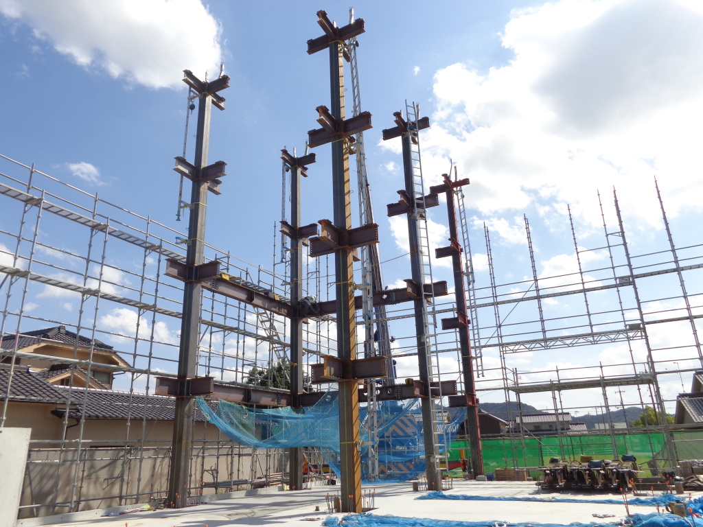 澄み渡る秋空の下で鉄骨建方始まりました。